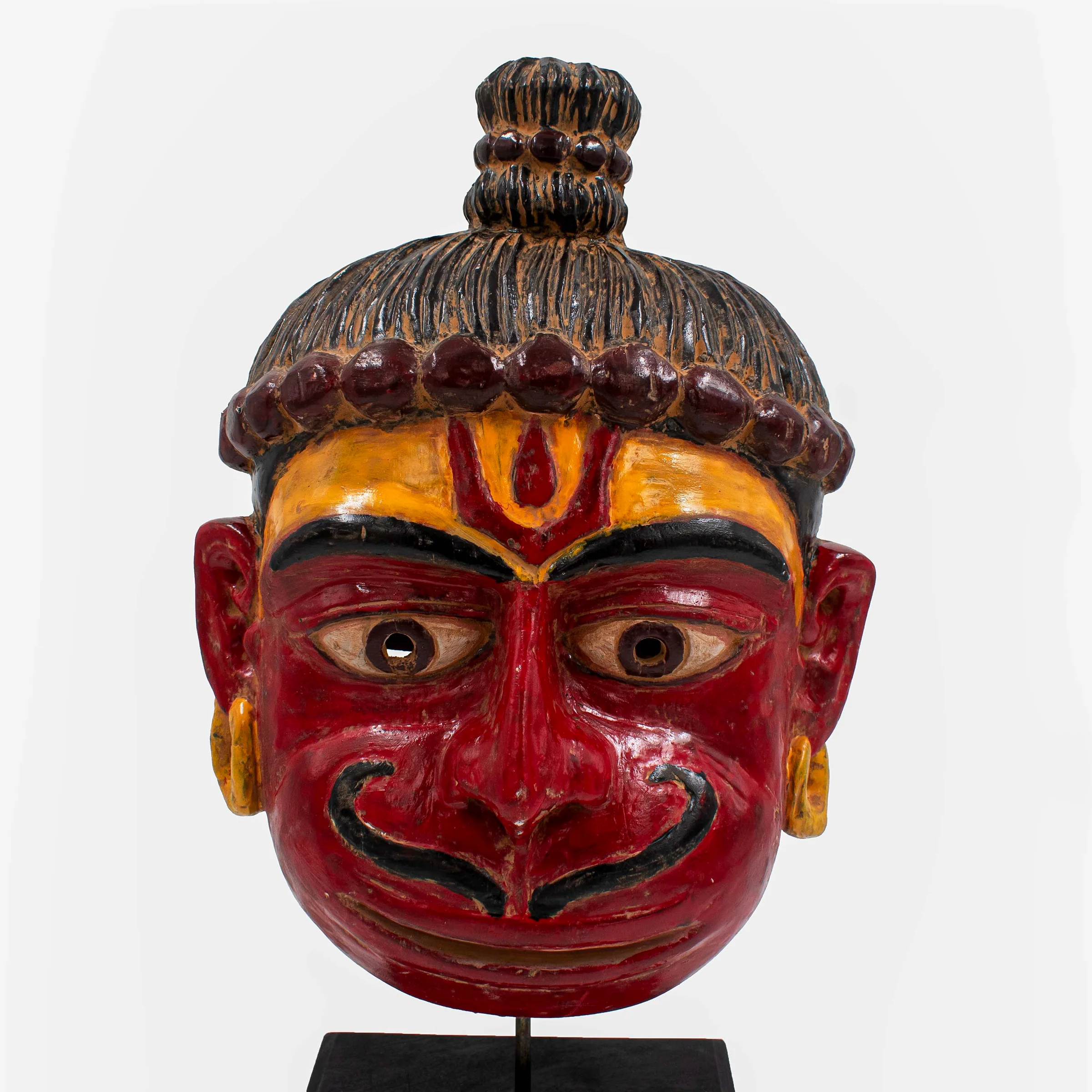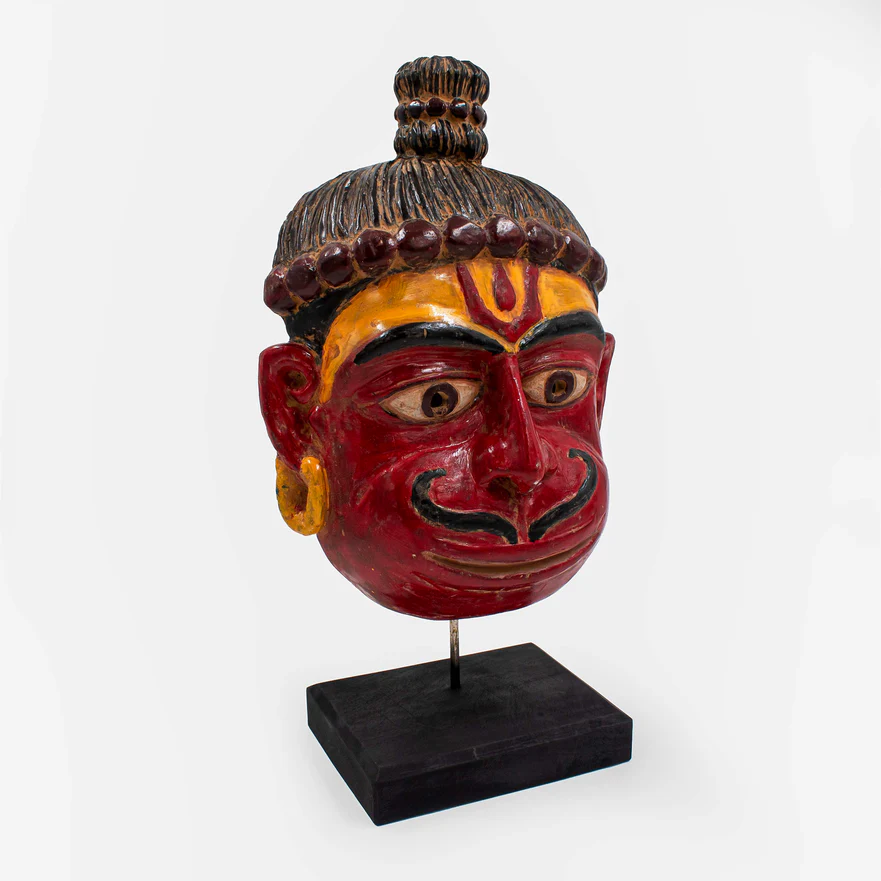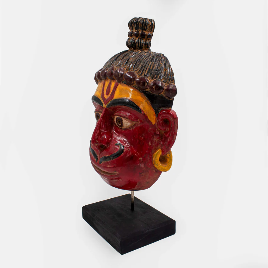 Introducing the Rama Bhakta Mask with Stand, crafted meticulously from Sal Wood, this divine piece embodies the revered deity, Hanuman. Revered for his unwavering devotion to Lord Rama, Hanuman symbolizes strength, loyalty, and devotion. This intricately carved mask captures the essence of Hanuman's divine presence, with attention to detail that accentuates his iconic features and expression. The accompanying stand adds an elegant touch, allowing for prominent display in any space, whether at home, in a meditation room, or as a centerpiece in a spiritual setting. Each curve and contour of the mask reflects the artisan's dedication to preserving the essence of Hanuman's character, making it not just a decorative item but a profound symbol of faith and reverence. Embrace the aura of devotion and spirituality with this exquisite Rama Bhakta Mask with Stand, a timeless addition to any sacred collection.